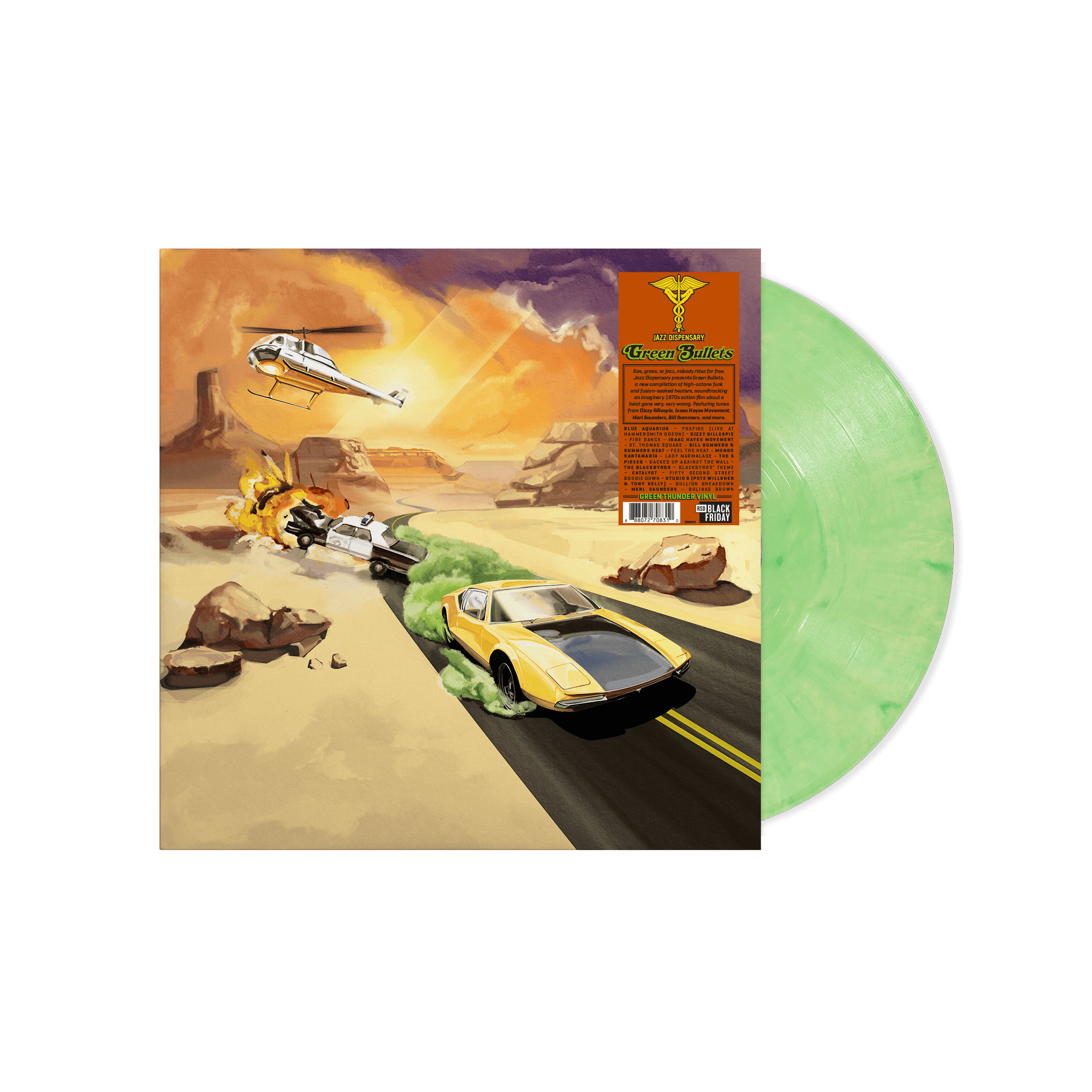 Gas, grass, or jazz—nobody rides for free. Green Bullets is the latest joyride from Jazz Dispensary’s cult-favorite compilation series: a crate-digging tour through high-octane funk, fusion, and cinematic grooves that feels like the soundtrack to a 1970s action caper gone very, very wrong. Dizzy Gillespie turns up the heat, Isaac Hayes Movement locks into head-nodding swagger, Mongo Santamaría flips a familiar melody into Latin-funk bliss, and deep-catalog heroes like Blue Aquarius, Catalyst, and Studio G keep the needle on full throttle. Like past Jazz Dispensary installments that have become RSD fan rituals, Green Bullets pairs audiophile-minded mastering with heady infectious grooves—made for DJs, collectors, and anyone who loves their jazz with octane and attitude. Pressed on “Green Thunder” color vinyl, limited to 5,800 worldwide.